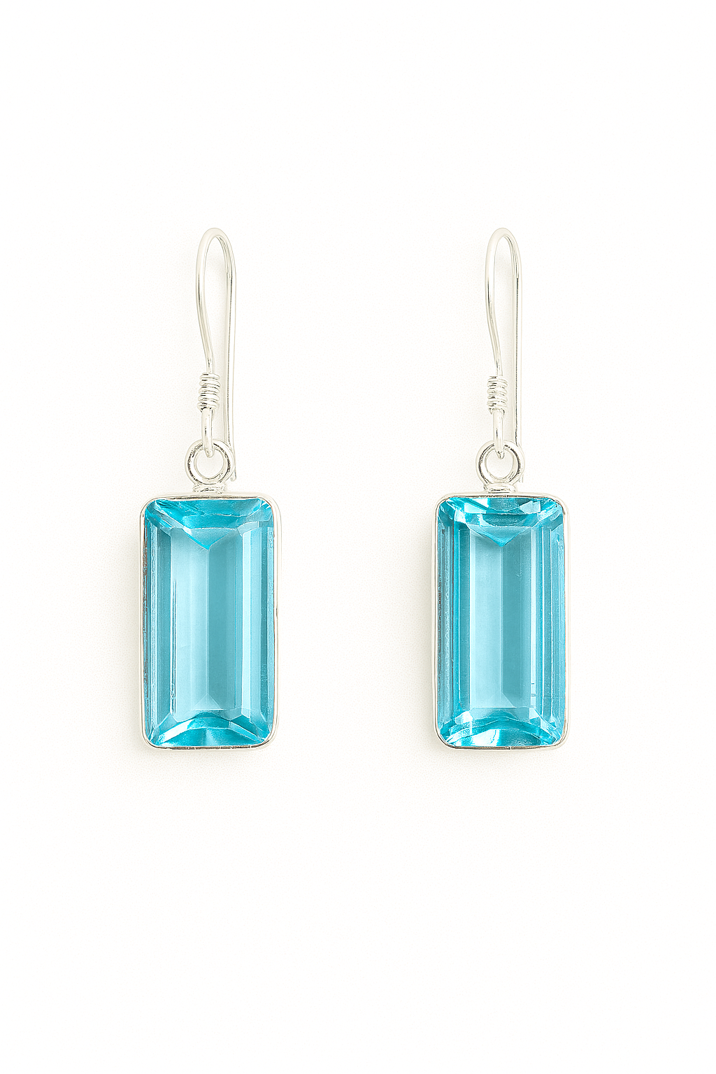 Clean and modern, these Blue Quartz earrings feature beautifully faceted stones in a sleek rectangular silhouette. Their crisp blue tone and elongated shape create a refined sparkle, while polished sterling silver hooks add effortless elegance. Perfect for everyday wear or a subtle statement look.