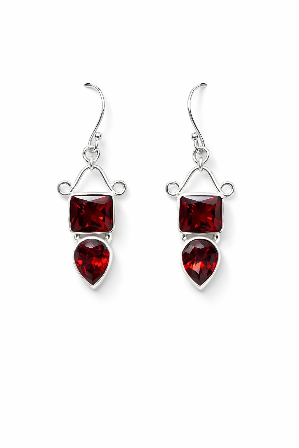 These striking garnet drop earrings feature a bold yet elegant silhouette crafted in polished sterling silver. Each earring showcases a richly colored square-cut garnet paired with a faceted teardrop garnet below, creating depth, movement, and dramatic brilliance. The clean bezel settings and delicate silver wire accents balance strength and sophistication, making these earrings a standout piece for both evening wear and elevated everyday styling.