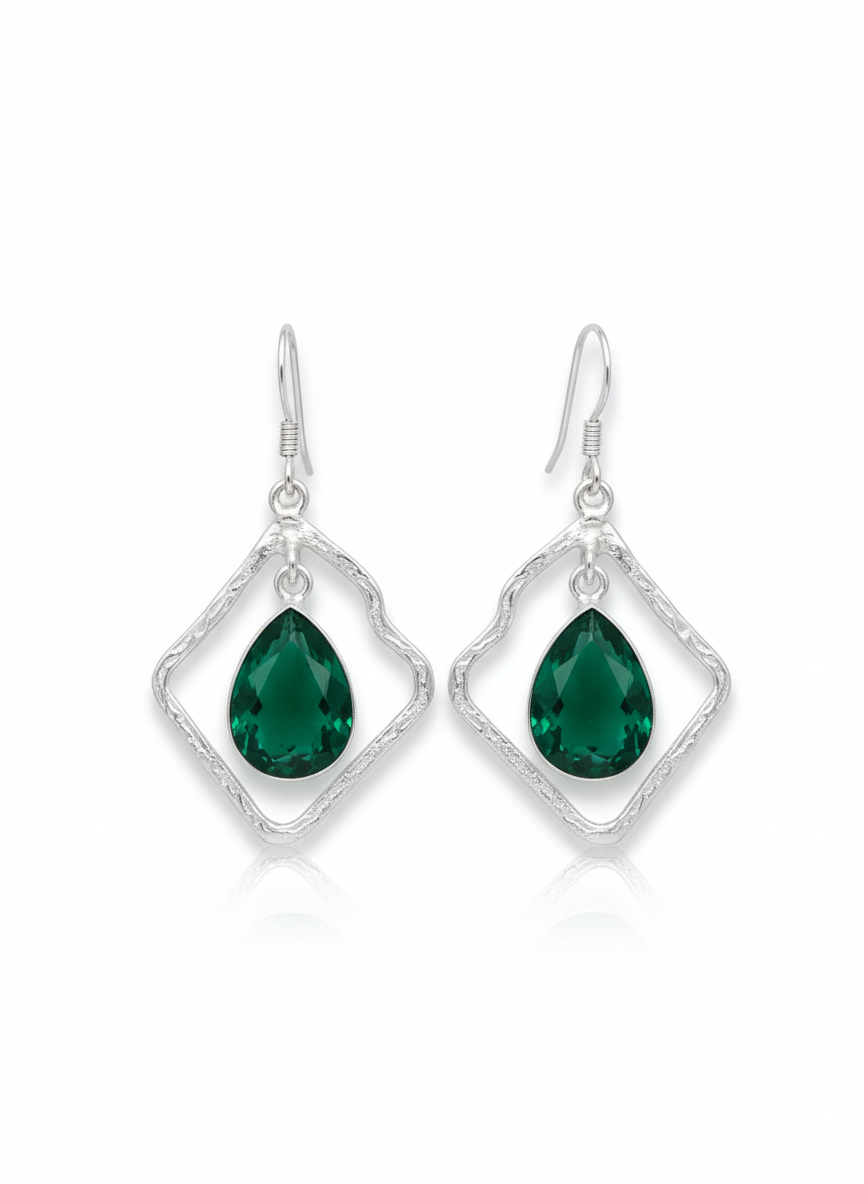Modern elegance meets timeless allure in these striking earrings featuring faceted emerald-green teardrop stones suspended within textured diamond-shaped sterling silver frames. The open geometric design enhances movement and light reflection, highlighting the deep, rich hue of the emeralds. Perfect for adding a touch of refined sophistication to any occasion.