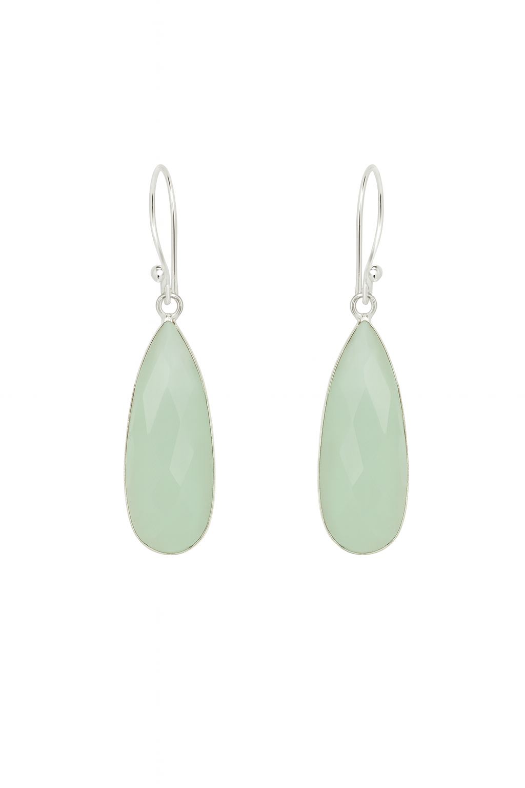 Elegant and calming, these earrings feature elongated teardrop-shaped Chrysoprase gemstones in a soft mint-green hue. The faceted stones shimmer beautifully within polished sterling silver settings, creating a timeless and graceful look perfect for any occasion.