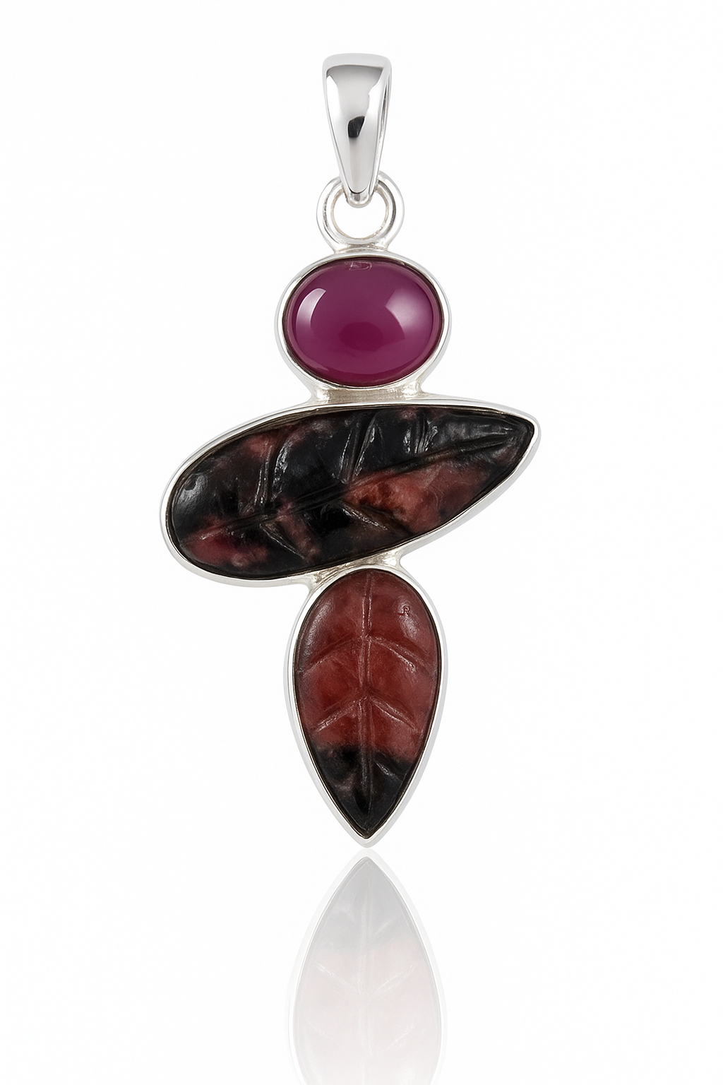This handcrafted pendant showcases a vibrant oval Tourmaline paired with two carved Rhodonite leaf stones, creating a natural, sculptural design. Set in high-polish 925 sterling silver, the combination of smooth and carved textures gives this piece an elegant, earthy appeal—perfect for everyday wear or statement styling.