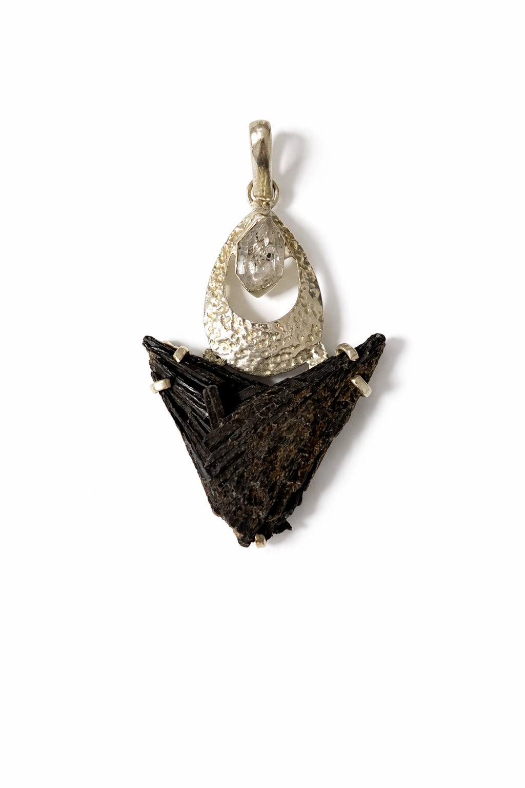A striking pendant featuring raw black kyanite paired with a luminous Herkimer diamond, suspended from a textured sterling silver teardrop. The bold, angular kyanite brings depth and edge, while the naturally double-terminated quartz adds clarity and light. A powerful, one-of-a-kind design that blends raw energy with refined craftsmanship.
