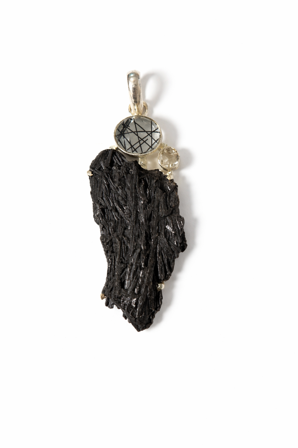 A bold, organic pendant featuring raw black kyanite with rich texture and natural depth. Accented with a faceted rutilated quartz displaying striking needle-like inclusions and a subtle white topaz gemstone, this piece blends raw beauty with refined detail. Each pendant is naturally unique.