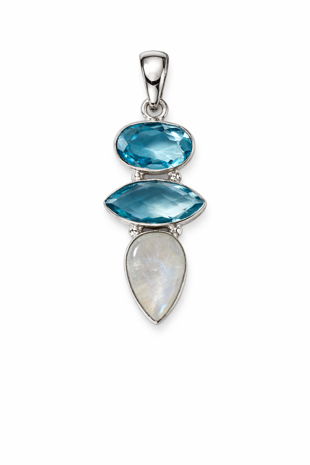 This elegant sterling silver pendant pairs luminous blue quartz with a glowing rainbow moonstone in a graceful vertical design. The faceted blue quartz stones provide vibrant sparkle and depth, while the smooth rainbow moonstone cabochon reveals soft flashes of iridescence. Together, they create a timeless piece inspired by light, clarity, and subtle color play.