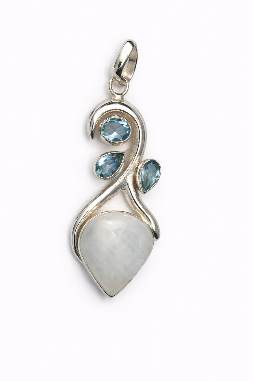 This elegant pendant features a luminous natural moonstone framed in flowing 925 sterling silver, accented with three faceted blue topaz stones that add cool, ocean-blue brilliance. The design showcases graceful, sculptural silver curves that create movement and balance, allowing each gemstone to stand out beautifully.