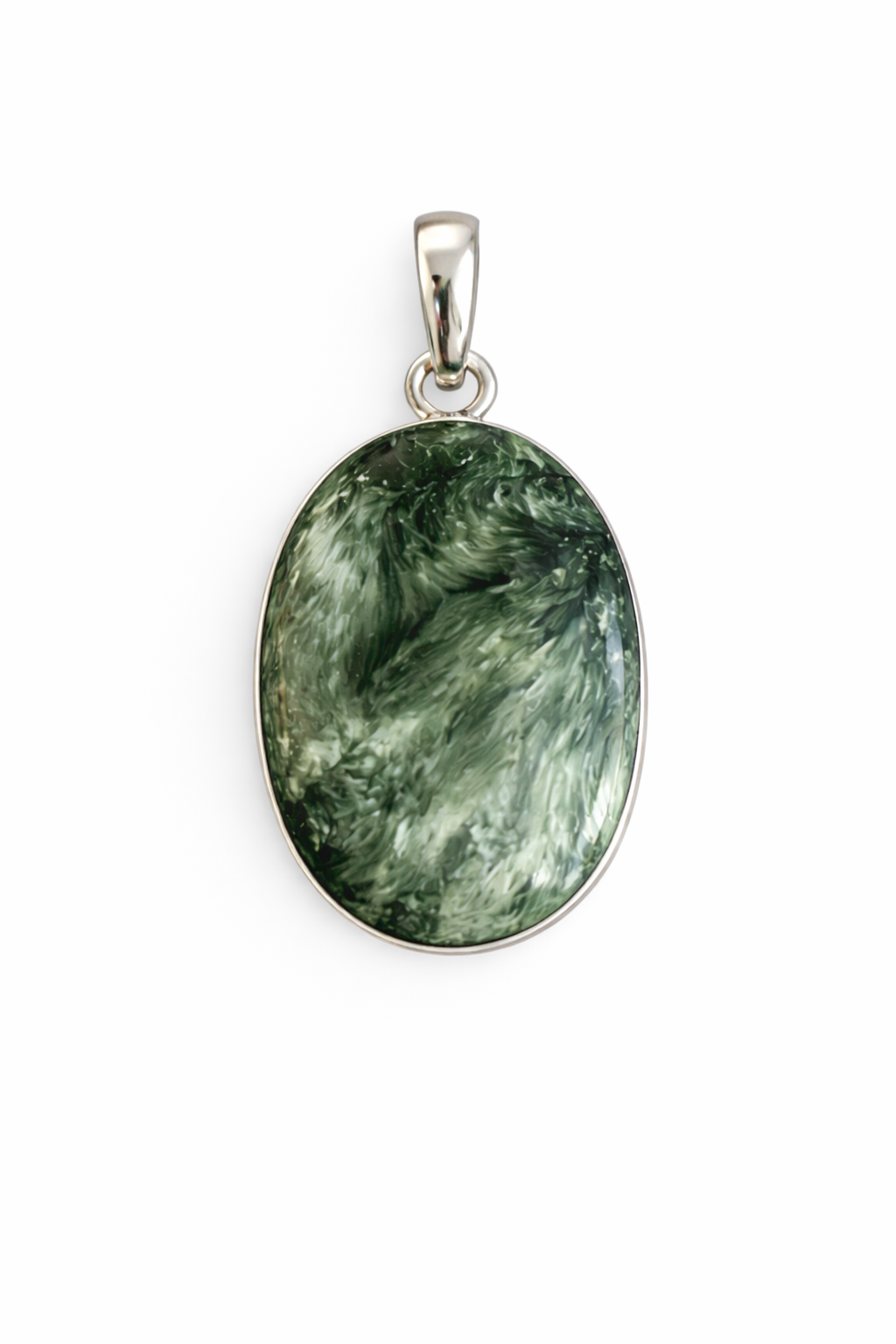 This elegant seraphinite pendant showcases the stone’s signature feather-like inclusions in rich, mossy green tones. Smoothly polished and set in sterling silver, it offers a refined yet organic look—perfect for everyday wear or layering with other gemstone pieces.