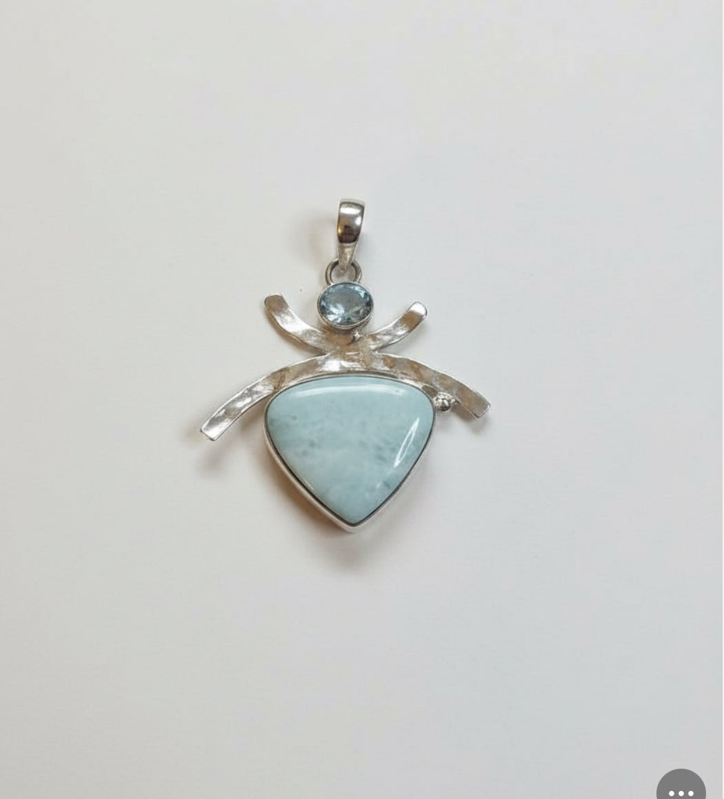 This elegant pendant features a smooth, triangular larimar cabochon in soft ocean-blue tones, accented above by a sparkling blue topaz. Set in polished 925 sterling silver with an artistic, openwork design, the piece captures a light, airy feel inspired by sea and sky. A refined yet organic pendant perfect for everyday wear or layering.