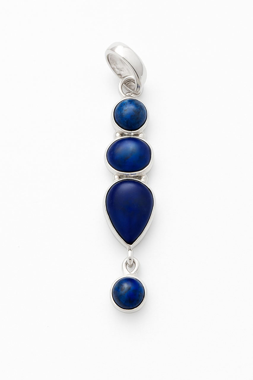 This striking sterling silver pendant features a sophisticated vertical arrangement of polished lapis lazuli gemstones. The deep, vibrant blue hues of lapis lazuli make this a captivating and elegant accessory, perfect for adding a touch of classic charm to any look.