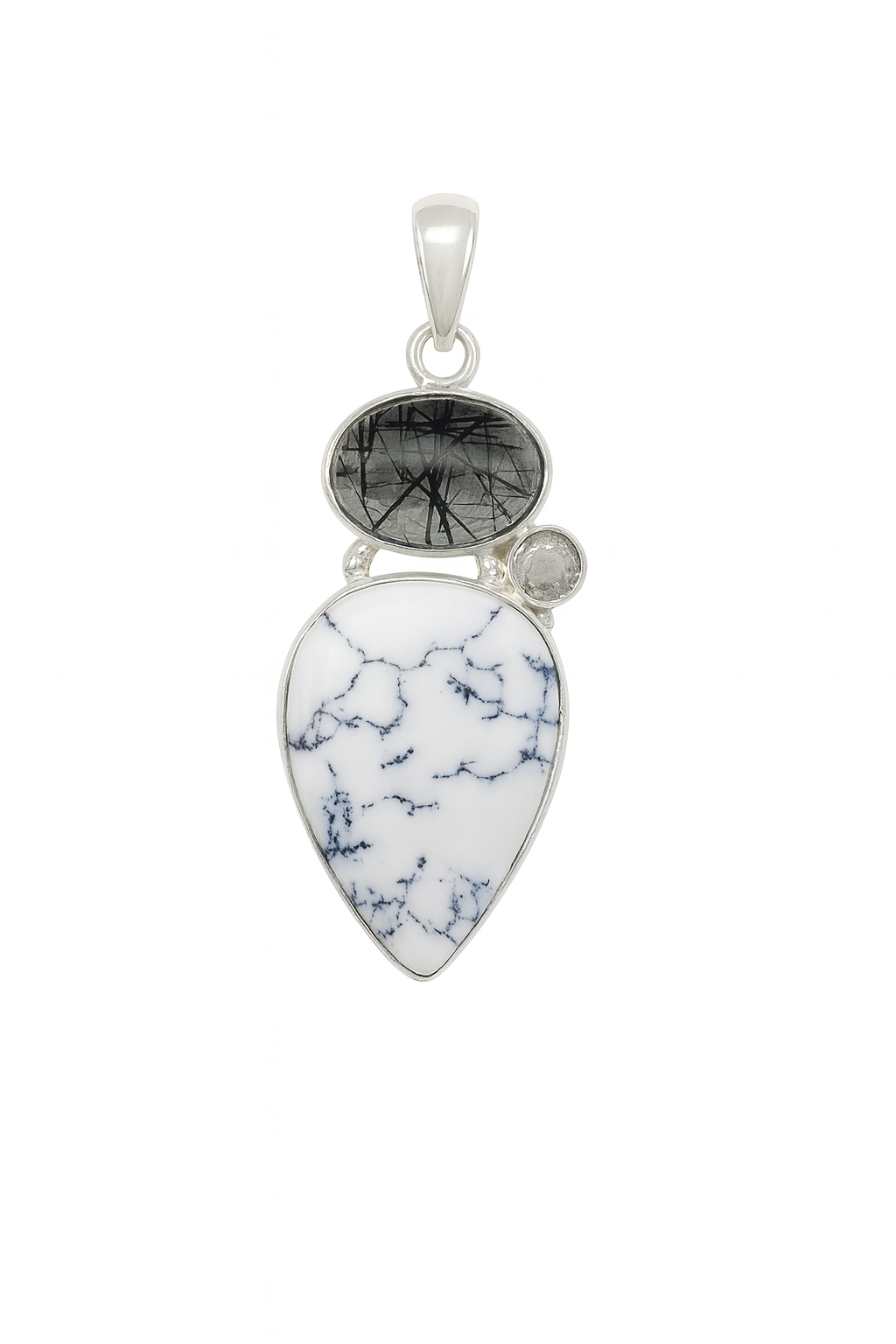 This striking pendant features a natural Dendritic Opal teardrop accented by an oval Rutilated Quartz and a round White Topaz, all set in polished sterling silver. The Dendritic Opal displays delicate blue-gray branchlike inclusions across a milky white surface, while the Rutilated Quartz showcases fine golden rutile threads that add depth and contrast.