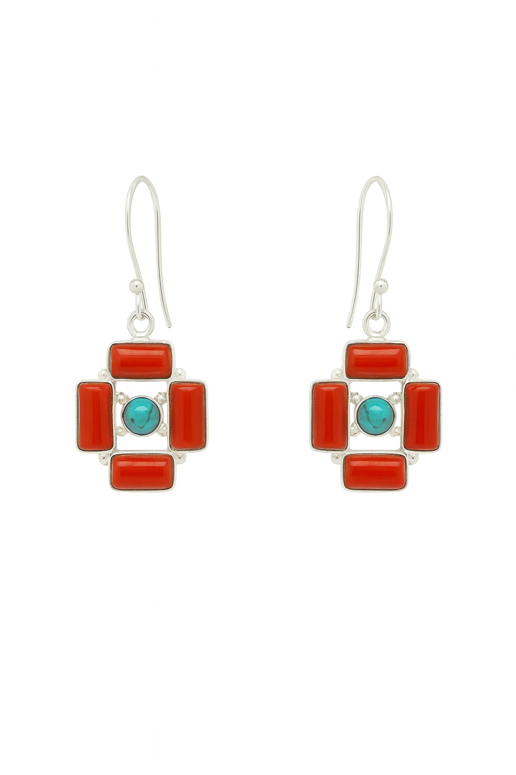 Striking and vibrant, these earrings feature four rectangular red coral stones surrounding a round turquoise center, creating a bold geometric design. The vivid contrast of warm coral and cool turquoise embodies a Southwestern-inspired elegance. Set in polished sterling silver, these earrings add a statement touch of color and artistry to any look.