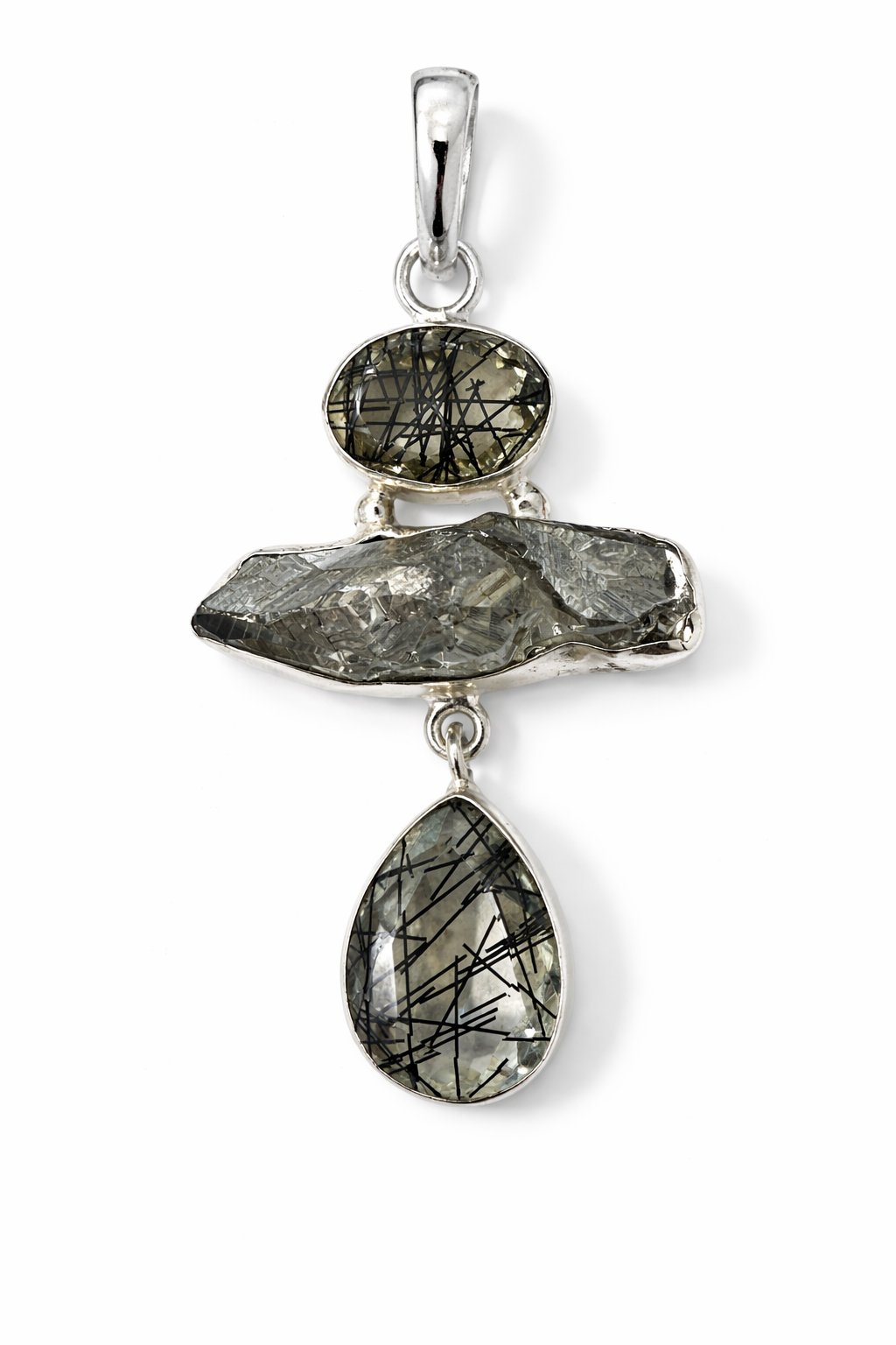 This bold statement pendant showcases the dramatic beauty of black rutilated quartz, known for its striking needle-like inclusions that naturally form unique patterns within the stone. Two polished rutilated quartz gemstones frame the design, their dark rutile threads creating an intricate, almost artistic lattice within the crystal.