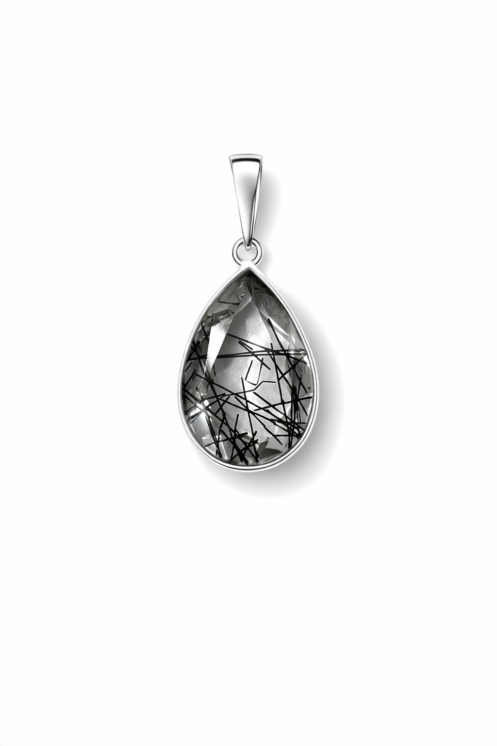 Refined and striking, this teardrop pendant features natural black rutilated quartz set in polished sterling silver. Each stone is uniquely threaded with fine, needle-like inclusions, creating an organic pattern that makes every piece one of a kind.