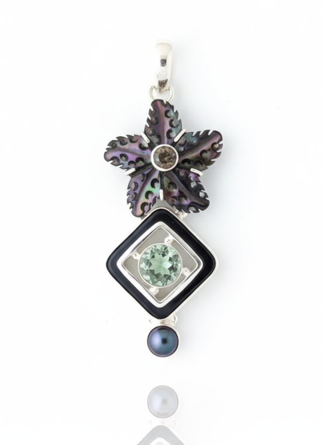 This pendant features a carved black mother of pearl flower accented with a smokey quartz center, a faceted green amethyst, and a black pearl. Set in sterling silver, it combines iridescent, earthy, and elegant tones for a refined and artistic design.