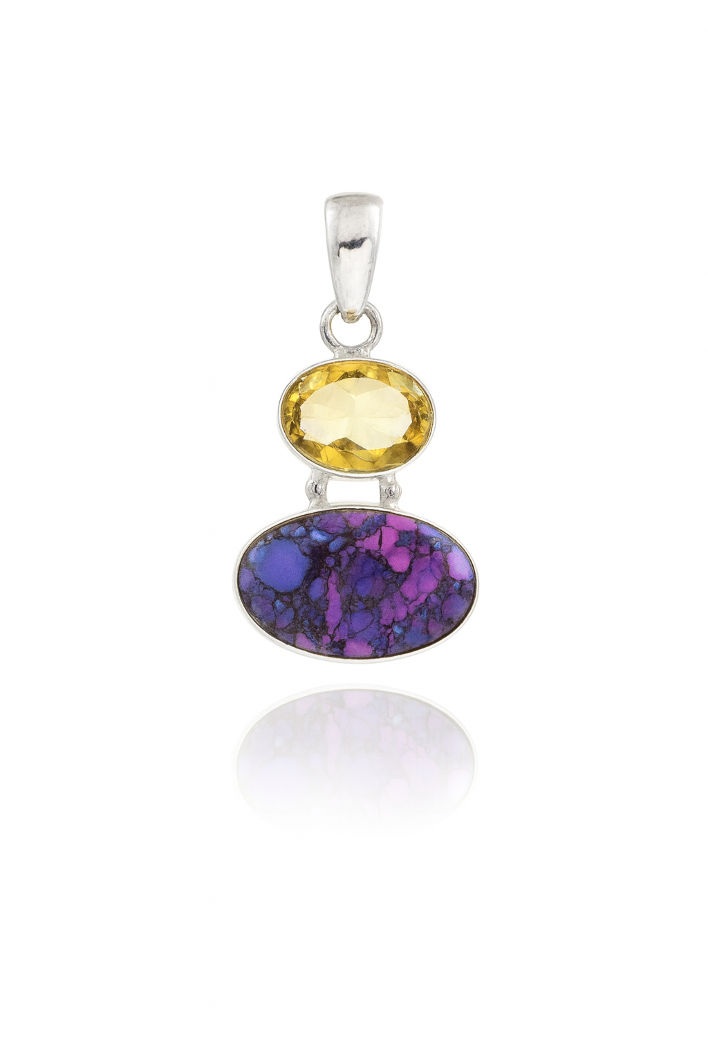 This pendant features a faceted golden citrine paired with a vibrant purple and blue Mohave turquoise stone, both set in sterling silver. The combination of warm and cool tones creates a bold, eye-catching look perfect for adding color to any outfit.