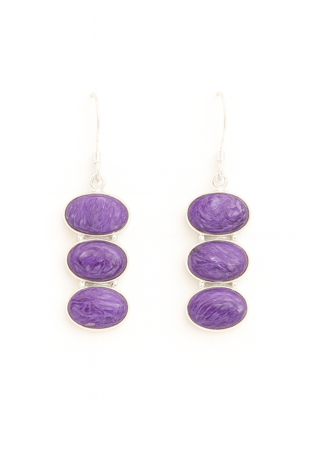 A bold vertical drop featuring three linked oval cabochons of mesmerizing Charoite. The stunning swirls of violet and lavender are highlighted by the polished sterling silver setting, creating an elongated, rare, and sophisticated statement.