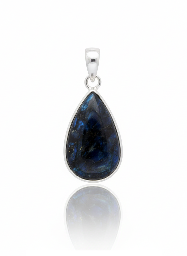 This pendant features a polished teardrop-shaped Pietersite stone set in sterling silver. The deep blue and golden swirls within the stone create a captivating, storm-like pattern, making each piece unique and eye-catching.