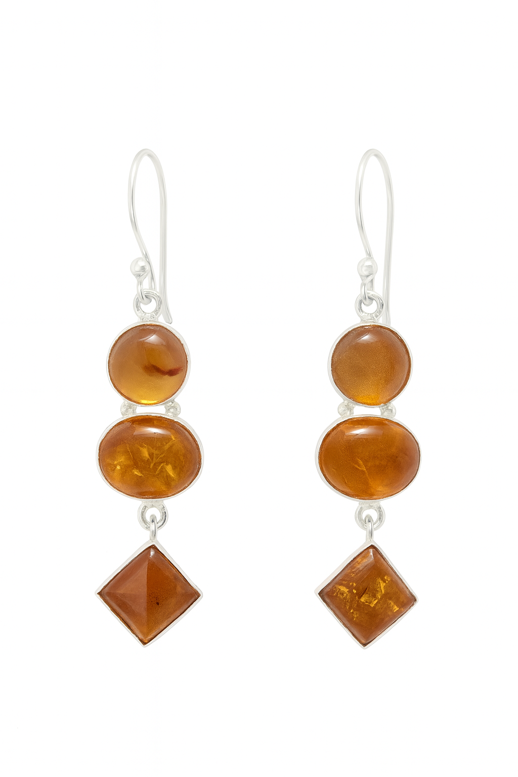 Warm and luminous, these earrings feature a trio of honey-colored amber stones in round, oval, and diamond shapes. The smooth cabochon finish highlights the natural inclusions and golden glow of each gem, while the sterling silver setting adds a refined touch. Their balanced, elongated design brings movement and elegance—perfect for both everyday wear and special occasions.