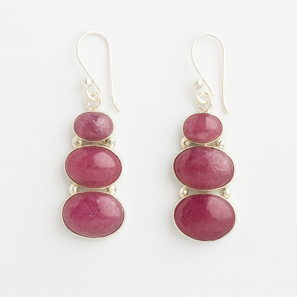 These elegant Tourmaline earrings feature three graduated cabochon stones in rich pink hues, beautifully set in sterling silver. Their vibrant color and smooth polish create a timeless, sophisticated look perfect for any occasion.