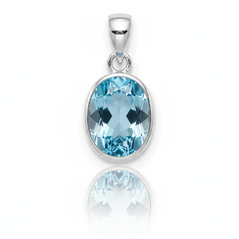 This elegant sterling silver pendant features a smooth, polished oval Blue Quartz gemstone. The stone's subtle blue hue and clarity create a tranquil and sophisticated look, perfect for adding a touch of serene color to any daily or evening outfit.