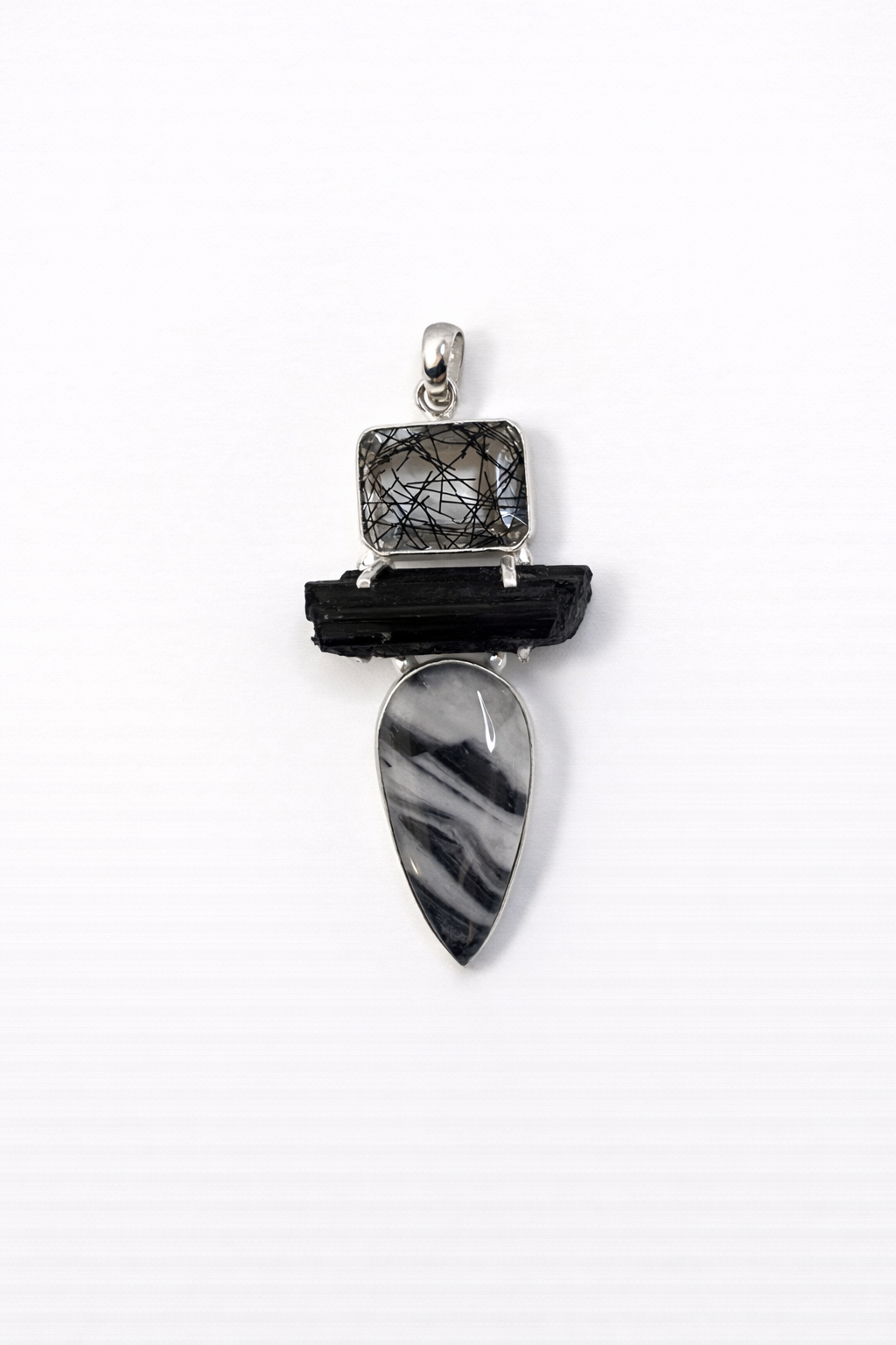 This bold, multi-stone pendant features a striking composition of contrasting black-and-white gemstones. At the top, a square-cut black rutilated quartz showcases dramatic needle-like inclusions, creating depth and visual intrigue. Below it, a raw black tourmaline bar adds a strong, organic accent with natural texture. The design is anchored by an elongated zebra jasper drop, known for its distinctive black striping against a soft white background.