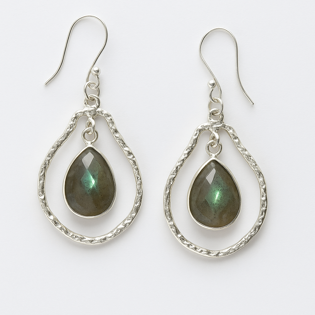 These captivating drop earrings showcase the magical light play of Labradorite. Each piece features a polished teardrop-shaped Labradorite cabochon, set within an open sterling silver teardrop-shaped frame. The stone's shimmering flash (labradorescence) creates a stunning, halo-effect focal point, blending natural beauty with sophisticated silver design.