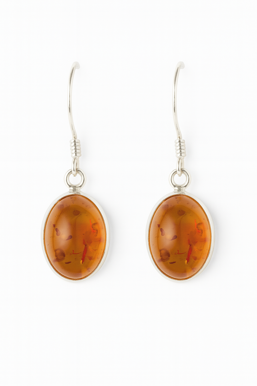 Embrace the warmth of nature with these simple, elegant drop earrings. Each earring features a highly polished oval cabochon of rich, fiery amber. The deep cognac hue and internal natural inclusions give each piece a unique, glowing quality. Set in a smooth sterling silver bezel and suspended from a French hook, this solitaire style is a timeless accessory.