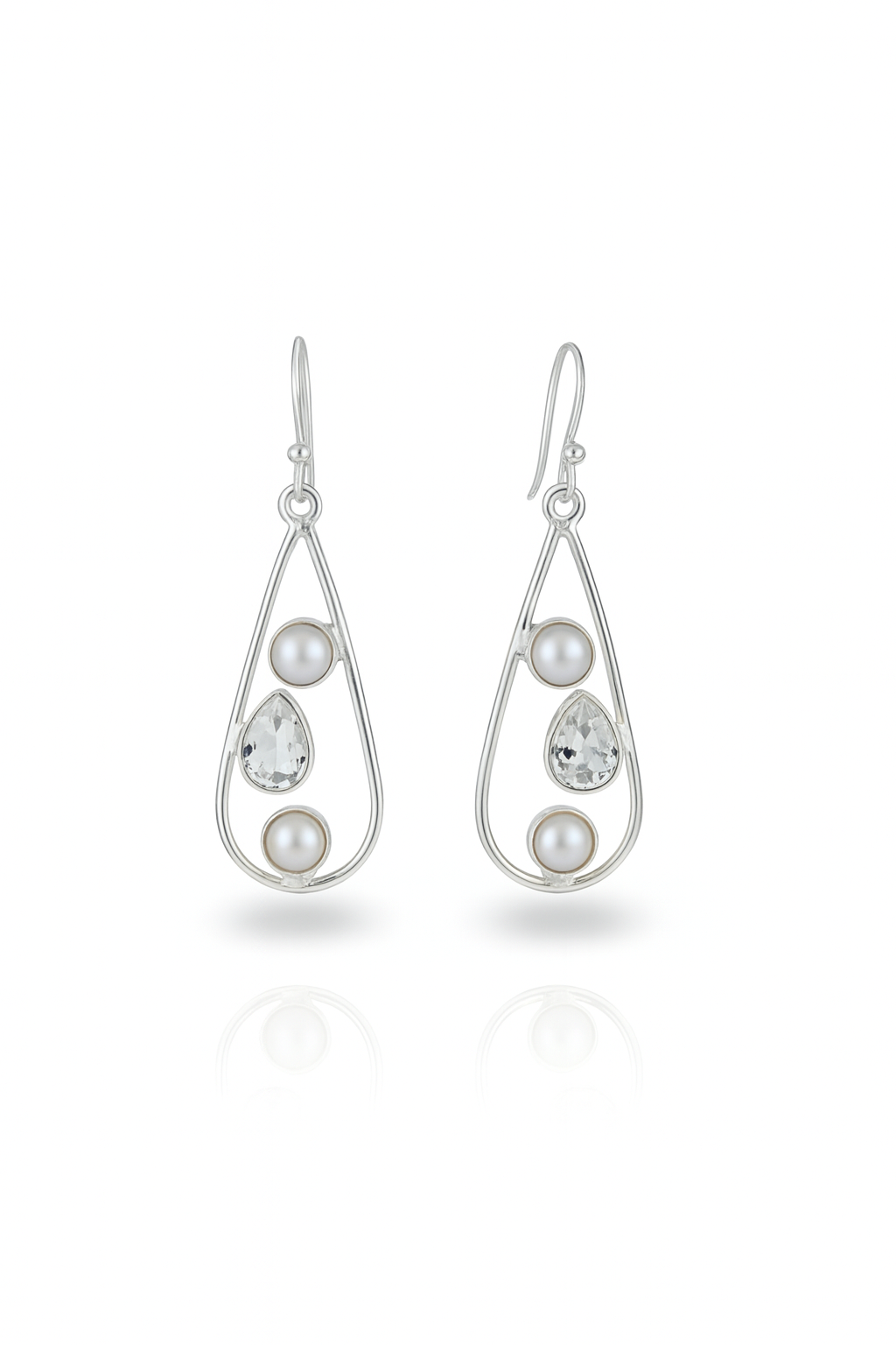 Graceful and luminous, these teardrop-shaped earrings feature a modern open-frame sterling silver design adorned with lustrous pearls and faceted white topaz gemstones. The combination of round and pear-cut stones creates a harmonious balance of softness and brilliance, enhancing both casual and elegant looks.