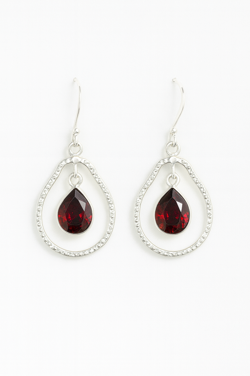 Elegant and timeless, these earrings feature deep red teardrop-shaped garnets suspended within open, textured sterling silver loops. The faceted garnets catch the light beautifully, creating a rich contrast against the polished silver. Their graceful teardrop silhouette and modern loop design make them perfect for both everyday sophistication and special occasions.