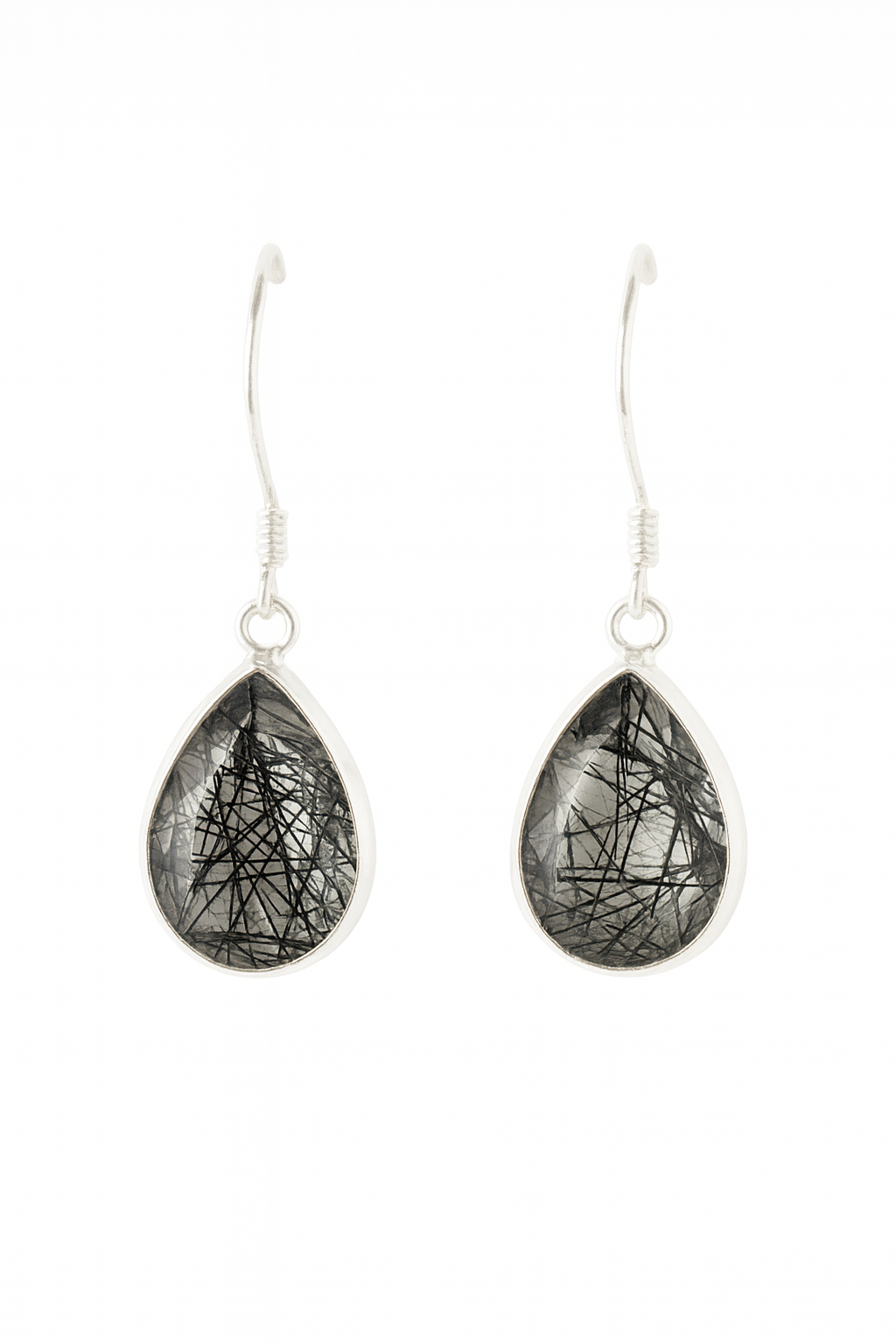 A unique and captivating accessory that combines natural clarity with striking detail. These elegant drop earrings feature a translucent Black Rutilated Quartz stone, cut into a polished teardrop (or pear) cabochon. The clear quartz showcases dramatic inclusions of black Rutile needles, creating a mesmerizing pattern often referred to as "Venus Hair." Set in a sleek sterling silver bezel, this refined solitaire style offers a modern artistic statement.