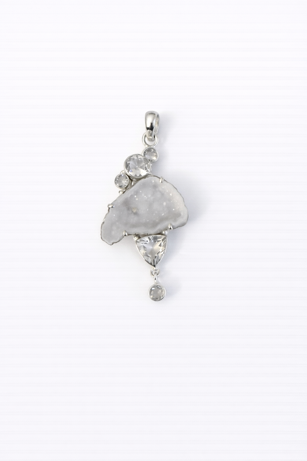 This elegant pendant features a natural white druzy crystal with soft, organic sparkle, accented by faceted white topaz for added brilliance and movement. Set in polished sterling silver, the design beautifully balances raw texture with refined shine. Each pendant is naturally unique, making it a subtle yet captivating statement piece.