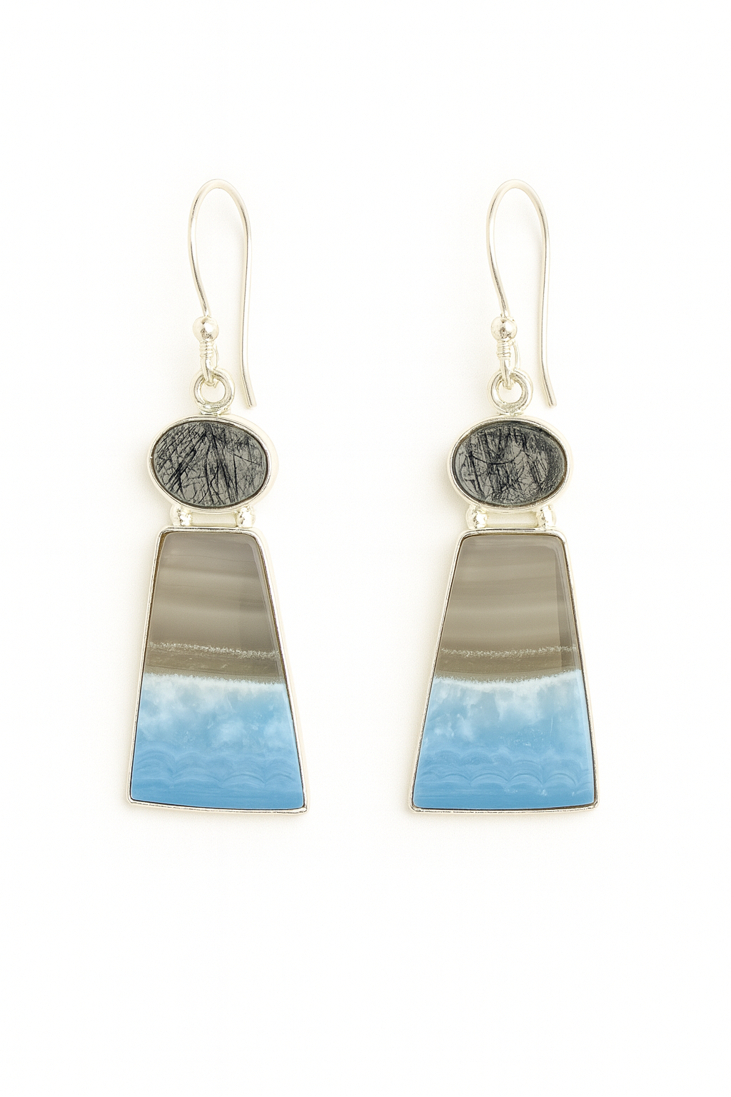 These striking drop earrings combine a darkly textured oval cabochon of Black Rutilated Quartz at the top with a large, banded Blue Opal cut into a modern tapered rectangle (trapezoid) shape at the base. The contrast between the needle-like rutile and the smooth, layered blue and gray opal creates a sophisticated, artistic statement, all set in sterling silver.