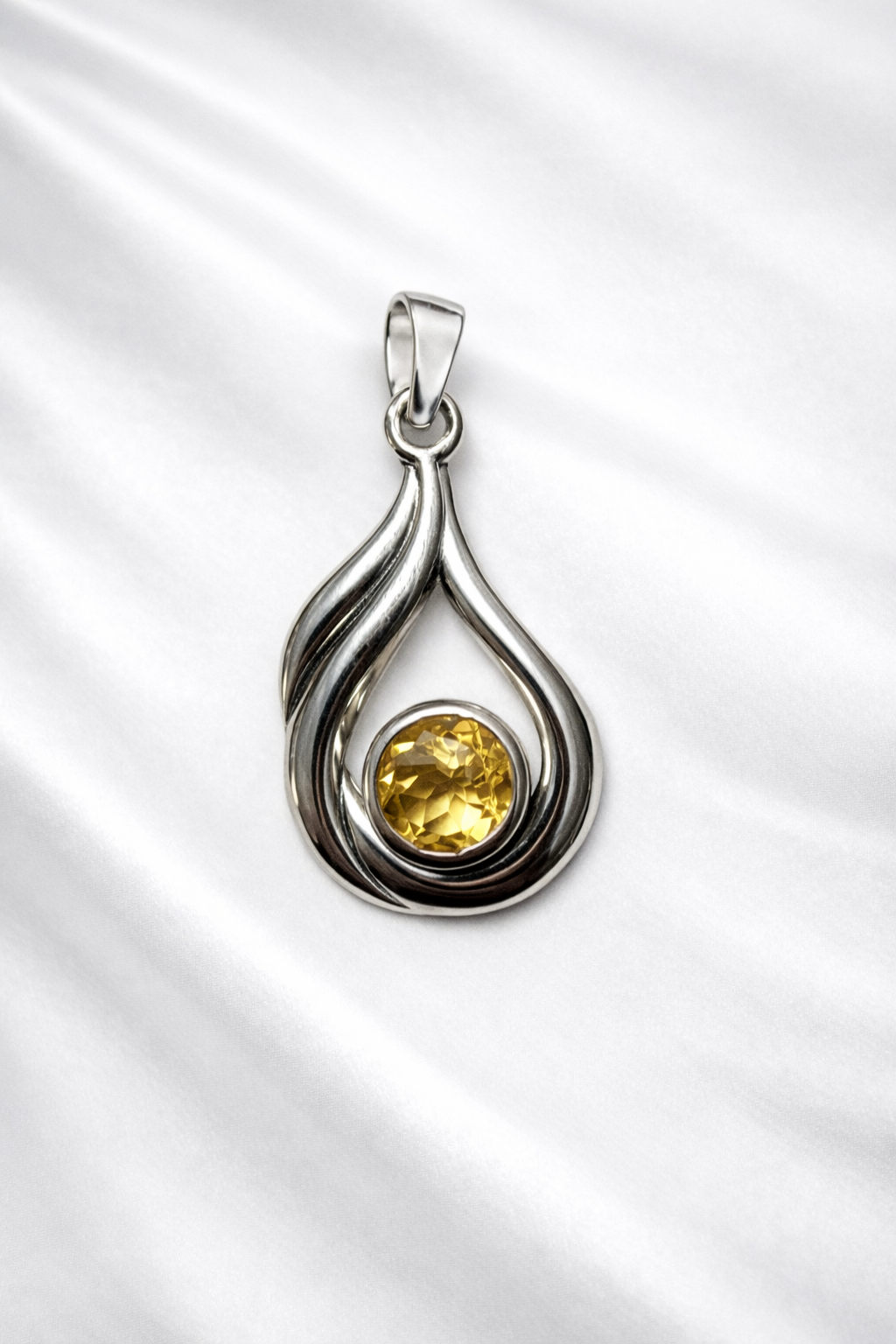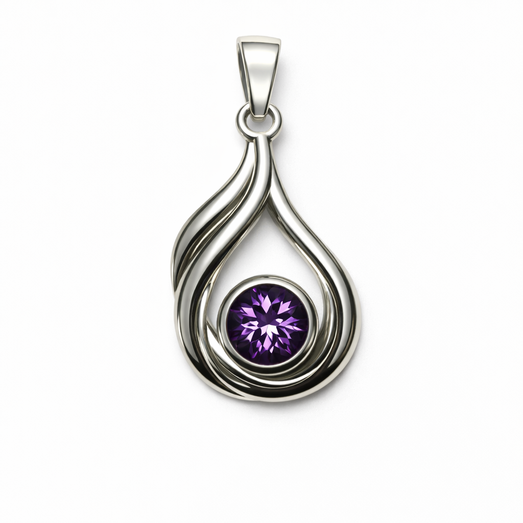 Graceful curves and radiant color come together in this sculptural swirl pendant. Crafted in high-polish 925 sterling silver, the flowing design wraps protectively around a brilliant round faceted gemstone, creating a look that feels both modern and timeless.