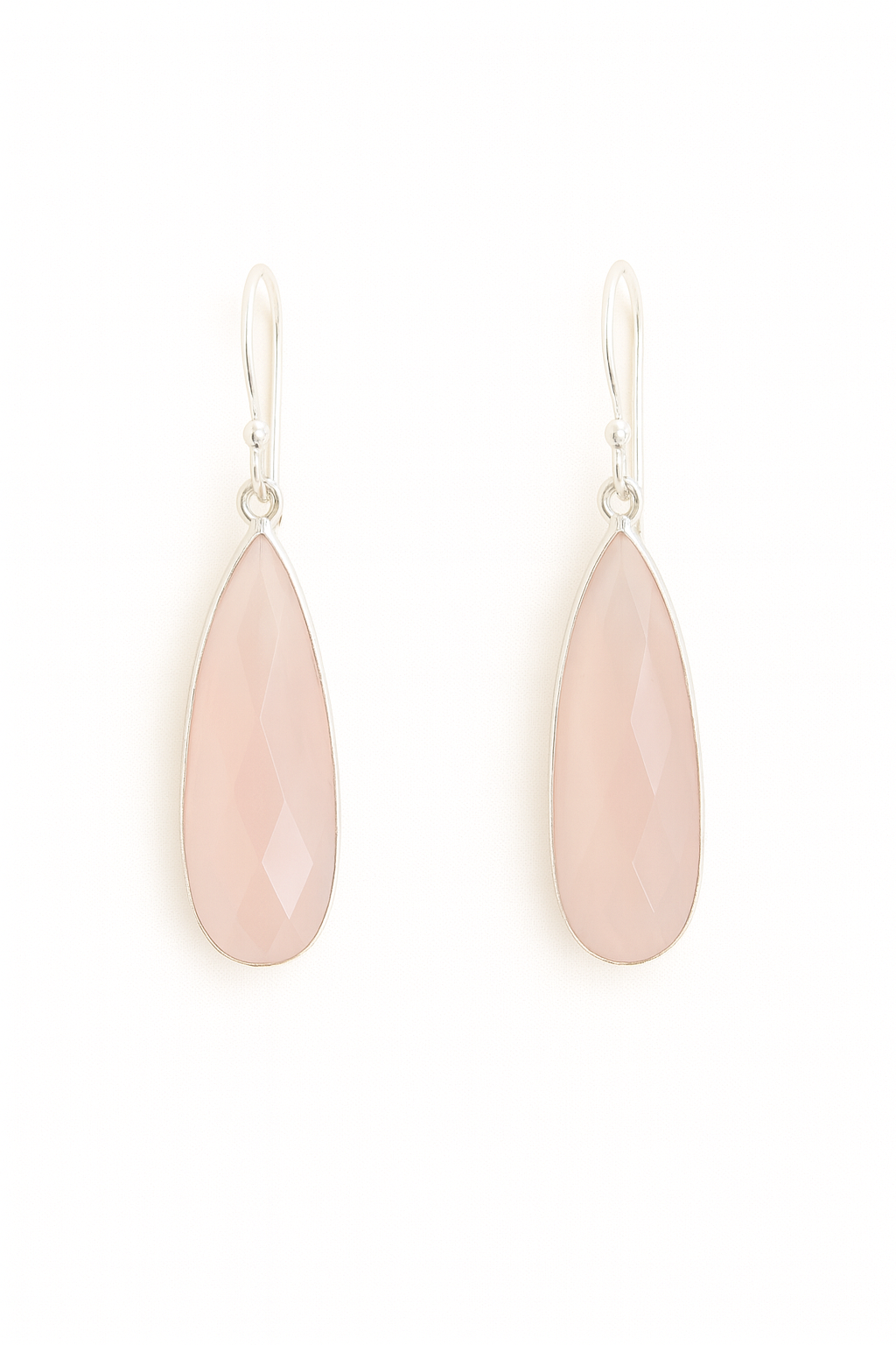 Delicate and serene, these elegant drop earrings feature beautifully faceted teardrop-shaped Rose Quartz gemstones. The soft, translucent pink hue of the quartz radiates gentle warmth, while the facets catch the light subtly. Each stone is set in a sleek sterling silver bezel, creating a graceful and timeless accessory perfect for everyday wear or a subtle touch of romance.