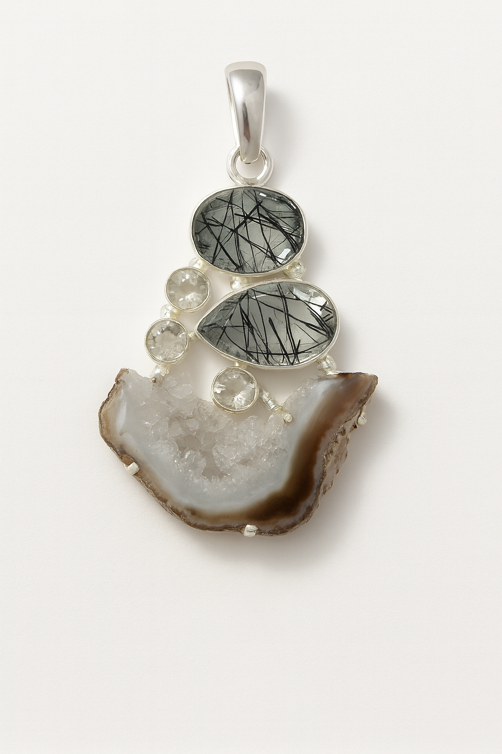 This one-of-a-kind pendant is a striking blend of raw elegance and modern artistry. Featuring dramatic black Rutilated Quartz with natural needle-like inclusions, sparkling clear quartz accents, and a raw geode slice with a crystalline center, this piece showcases powerful contrast and organic texture. Set in polished 925 sterling silver, the design celebrates the beauty of natural formations while offering a bold, statement-making look that feels both earthy and refined.